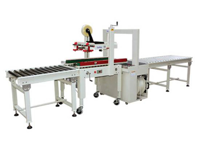 封箱機(紙箱膠帶封口)+高解析噴碼機(日期、批號、廠名等信息噴印打碼設(shè)備)+自動打包機(自動打出兩道PP帶。進行紙箱捆扎包裝)