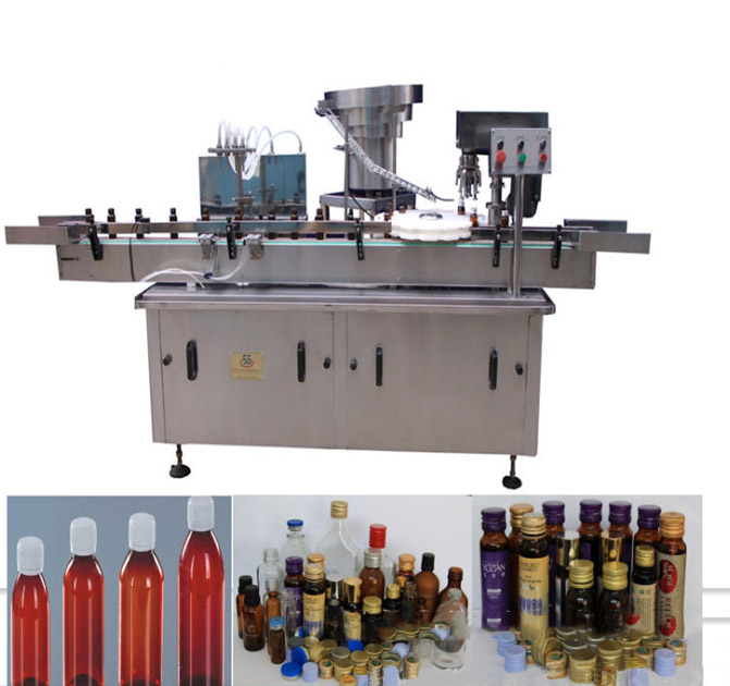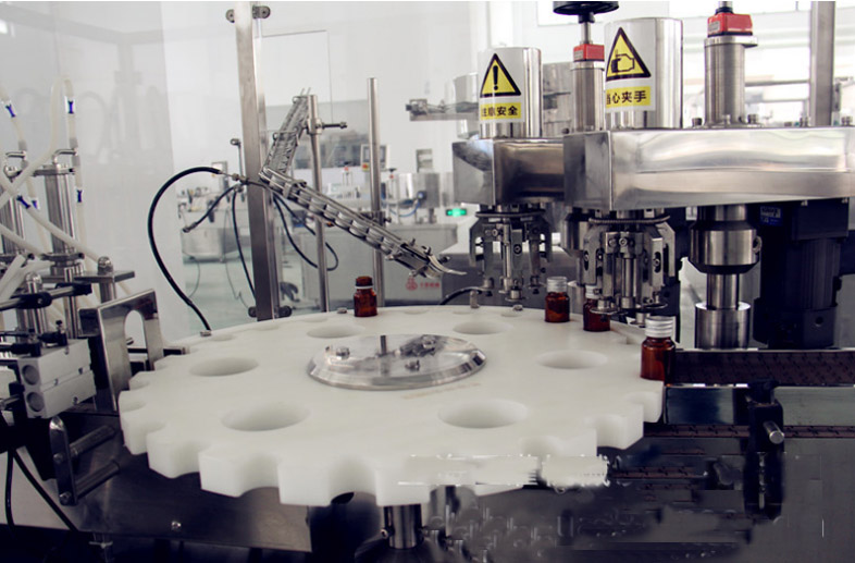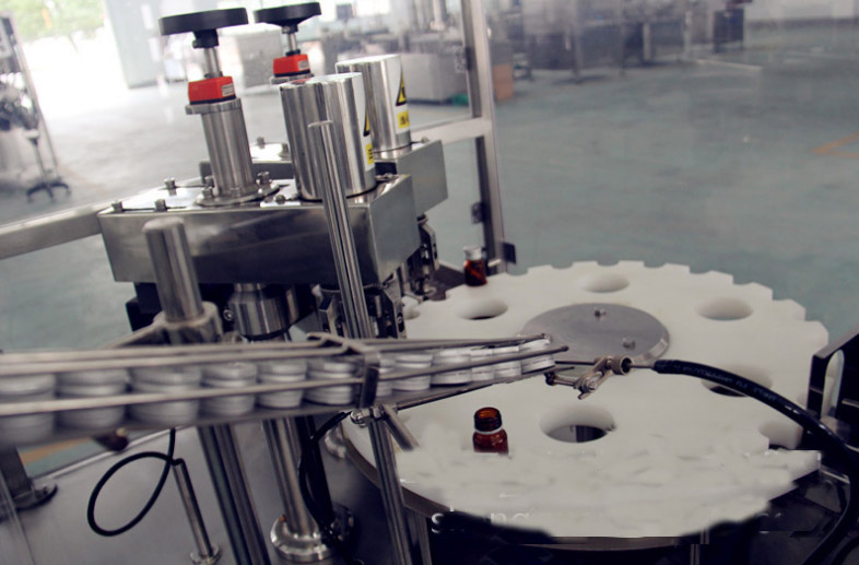 該西林瓶灌裝壓塞鎖蓋機(jī)集自動(dòng)進(jìn)瓶、理蓋、上蓋、抽吸真空、旋蓋、出瓶于一體,生產(chǎn)效率高,運(yùn)行穩(wěn)定可靠;西林瓶灌裝壓塞鎖蓋機(jī)的真空度可按需要設(shè)定,使用旋合式旋蓋原理和全密封真空式結(jié)構(gòu);該西林瓶灌裝壓塞鎖蓋機(jī)自動(dòng)化程度高,設(shè)計(jì)合理,主要是由瓶子輸送、理蓋、夾瓶掛蓋、旋蓋、電控等機(jī)構(gòu)和抽真空系統(tǒng)組成;此西林瓶灌裝壓塞鎖蓋機(jī)能耗低、適應(yīng)性好,旋蓋機(jī)構(gòu)高度可調(diào)節(jié),適應(yīng)相同口徑、不同高度的瓶子旋蓋;更換部分零件即可實(shí)現(xiàn)不同瓶徑、不同口徑的旋蓋,更換快捷方便;夾瓶子的托爪帶有膠墊,真空罩、旋蓋、配蓋機(jī)構(gòu)都是氣缸驅(qū)動(dòng),在使用過程中都能做出精確調(diào)整,動(dòng)作靈活;送蓋機(jī)構(gòu)有光電感應(yīng)安全保護(hù)裝置,可實(shí)現(xiàn)無蓋開機(jī)送蓋,蓋滿關(guān)機(jī)不送蓋;