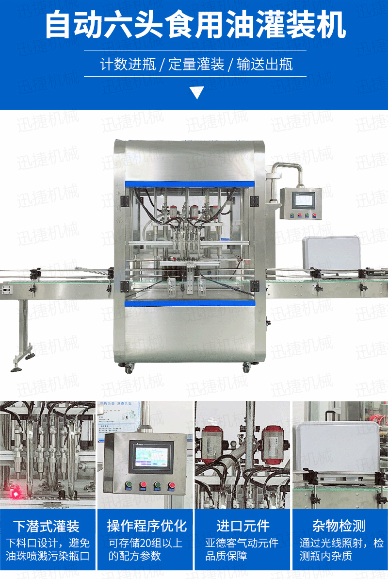 該系列灌裝機采用伺服柱塞式計量灌裝原理,適用于各種規(guī)格(0.1-1升可兼顧到2升灌裝)的南瓜籽油、榛子油、牡丹籽油、芝麻油、核桃油、山茶油、亞麻籽油、棉籽油、橄欖油、大豆油、玉米油、菜籽油等食用油灌裝。設(shè)備采用伺服系統(tǒng)定量推料,在人機界面數(shù)字化調(diào)節(jié)計量,并且可設(shè)定100ml或200ml等所需計量,觸摸屏一觸即達(dá),而且可以單頭微調(diào)計量。操作簡單,維護(hù)方便,節(jié)省人工成本,生產(chǎn)效率更高。