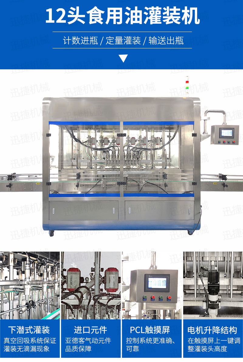 該系列玻璃瓶灌裝機采用容積式計量灌裝原理,適用于各種規(guī)(100ml-1000ml)的南瓜籽油、榛子油、牡丹籽油、芝麻油、核桃油、山茶油、亞麻籽油、棉籽油、橄欖油、大豆油、玉米油、菜籽油等食用油灌裝。設備采用伺服驅(qū)動活塞計量,保證了 1‰的灌裝精度,在保證灌裝精度的同時,提高了 20%-35%灌裝速度,操作簡單,維護方便,節(jié)省人工成本,生產(chǎn)效率更高。